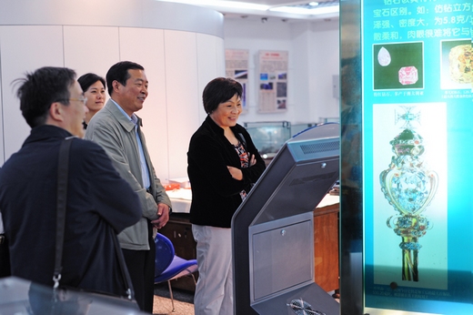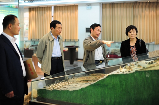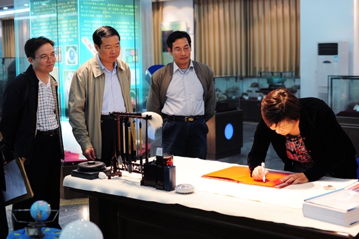 刘站长还实地考察了学校瓦斯地质研究实验室、地球科学馆等学校设施。在瓦斯地质研究实验室考察时,刘站长尤其对学校在瓦斯地质研究方面的重要成就,对煤矿安全生产的突出贡献十分感叹。在地球科学馆,刘站长参观了全部馆藏化石,对珍贵化石标本赞叹不已,不时驻足向陪同专家询问、探究,特别对馆内的“三叶虫化石”“中华龙鸟化石”“海洋鱼龙化石”“恐龙窝蛋化石”“地球生物演变痕迹模型”等十分感兴趣,连声说:“很不错!”“很丰富!”“很难得”,深深为百年办学的历史积淀和大自然的奇妙叹服,并愉快地在馆内留言薄上签名留念。随后,刘站长还高兴地与陪同视察的同志一起合影留念。