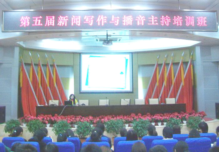 10月29日晚,由校党委宣传部主办,大学生新闻中心、校新闻社、大学生通讯社联合承办的我校第五届新闻写作与播音主持培训班在南校区力行楼圆形学术报告厅正式开班。焦作电视台主任播音王晓燕应邀为培训班学员作了一场题为《播音与主持艺术浅谈》的首场专题讲座。大学生新闻中心、校新闻社、大学生通讯社全体成员和广大新闻爱好者近300人参加了开班仪式。