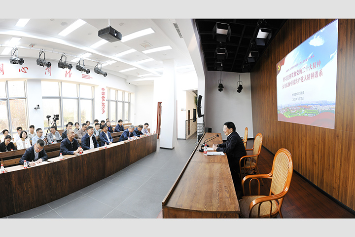 围绕学习宣传贯彻党的二十大精神,弘扬中国共产党人的精神谱系,邹友峰提出三点要求:一是要全面深入学习贯彻习近平新时代中国特色社会主义思想和党的二十大精神,扎实学好以党史为重点的“五史”,从党的百年奋斗史中汲取智慧和力量。二是要当好“关键少数”,加强品德修为,提振斗争精神,提升能力本领,发挥示范作用,打好开局起步“主动仗”。三是要立足“两个大局”、心怀“国之大者”,落实立德树人根本任务,在加快构建新发展格局中抢抓机遇,在推动高质量发展中创建一流,为建设国内一流特色高水平大学奋勇前进,为实现新时代中原更加出彩贡献力量。