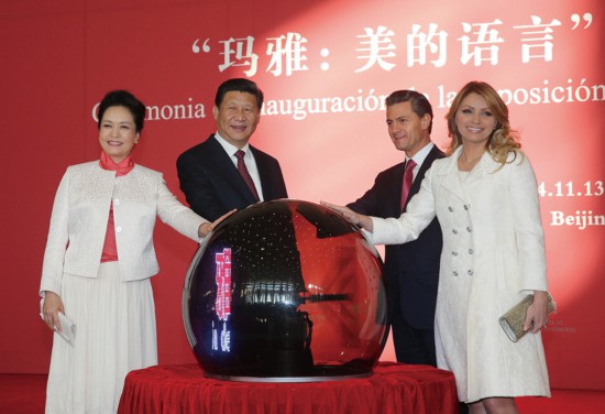 2014年11月13日,国家主席习近平同墨西哥总统培尼亚共同出席在国家博物馆举行的“玛雅:美的语言”文化展开幕式。这是习近平和夫人彭丽媛与培尼亚夫妇一同为展览剪彩。 新华社记者 刘卫兵/摄